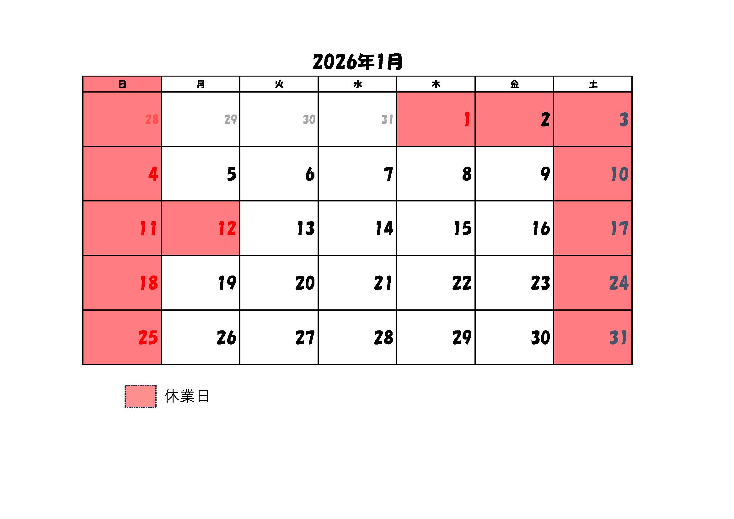 1月の営業日