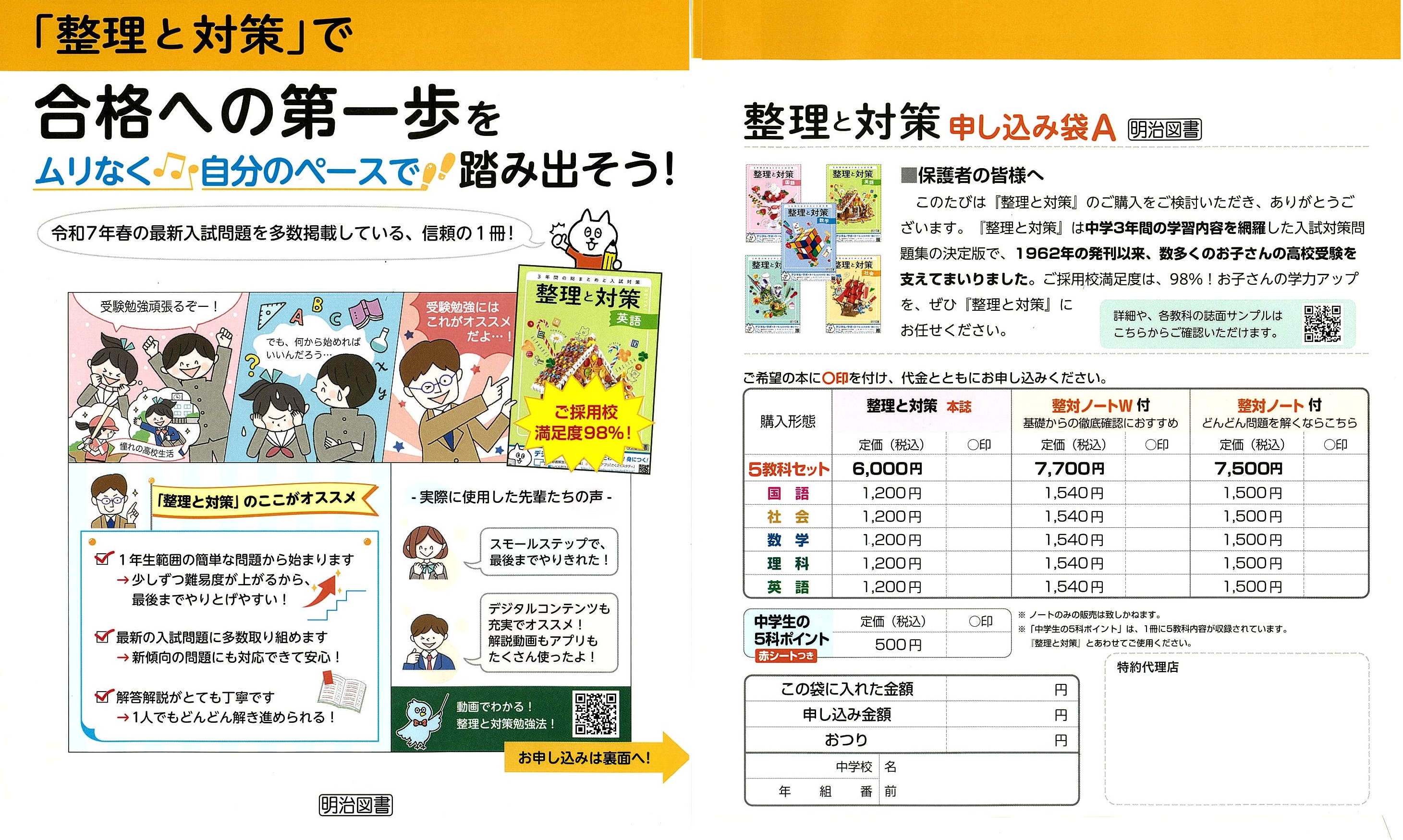 中学2年生(8年生)にむけての「整理と対策」販売を各学校様にて日にち限定の実施をお願いしております。